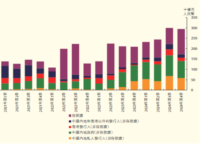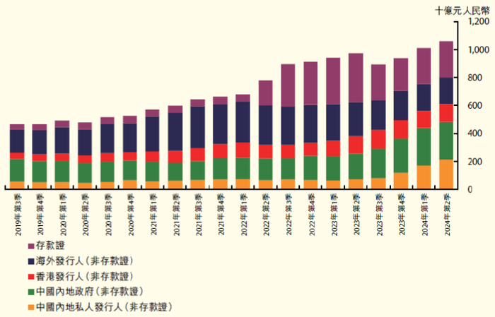 中国香港离岸人民币债券(点心债)于2007年起开始发展,根据中国香港金管局的披露,2024年点心债发行量同比增长36.7%至10718亿元,不含存单发行量同比抬升79.4%至7108亿元,截至2024年末,点心债存续规模同比增长36%至12644亿元。按发行主体看,国内政府类机构是点心债最主要的发行主体,主要包括财政部、地方政府、人行和政策行,其次是境内中资机构及企业,以银行为主,相比之下中国香港本地和海外主体发行比例较小。