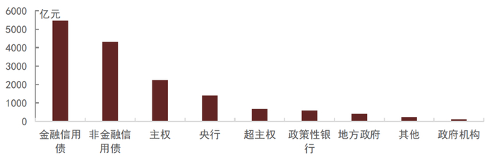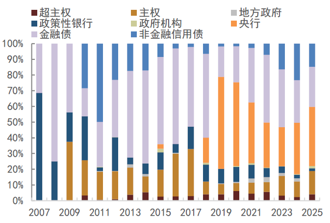 券种分布上,主要以金融信用债和人行发行的央票为主,2024年发行占比分别为27%和33%,其次为非金融信用债和主权债,2024年发行分别占比23%和10%。近两年金融债发行占比持续回落,非金融信用债、主权债和央票发行占比则整体抬升。