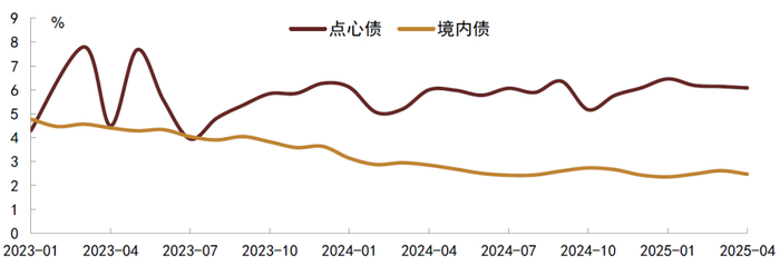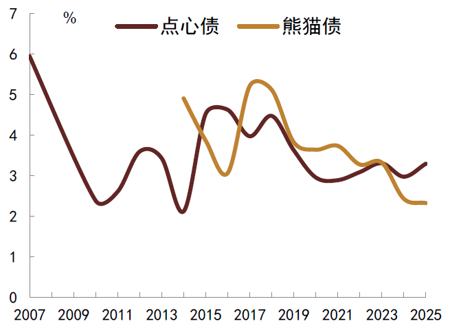 同样作为境外债,点心债相比于美元债可以节约汇率对冲成本,点心债高票息优势更为明显。对于境内人民币资金投资境外债需要特别防范汇率波动风险,汇率变动损益对回报率影响较大,2022年美联储大幅加息后,中美利差走扩,汇率波动较大,当前美元兑人民币锁汇成本较高,扣除锁汇成本后美元债相对吸引力下降,而点心债无需担心汇率波动,相较于美元债可以节约汇率对冲成本,相比之下点心债高票息优势更为明显。以城投点心债为例,2023年以来新发城投点心债票面利率明显高于境内城投债票面利率,2023年以来城投点心债整体发行票面利率波动,2024年新发点心债票面利率均值为5.83%,2025年以来均值为6.27%,高于2025年以来境内城投债票面利率均值2.48%。