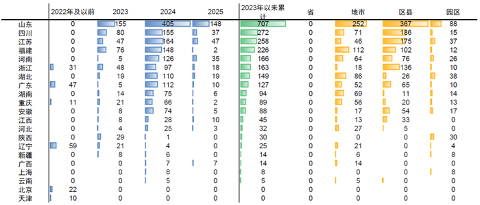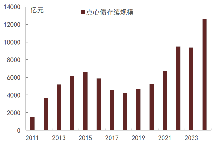 城投点心债2023-2025年发行量增长,城投点心债2022年及以前发行量较低,2014-2022年累计发行量179亿元,2023年发行量明显增长至549亿元,2024年进一步增长至1616亿元,2024年净增量为1553亿元。分省来看,2023年以来发行量位列前五的省份为山东、四川、江苏、福建和河南,发行量分别为707、272、258、226和166亿元,浙江、湖北和广东也超过100亿元。分行政级别来看,2023年以来新发中地市、区县和园区占比分别为37%、50%和13%,无省级新发。