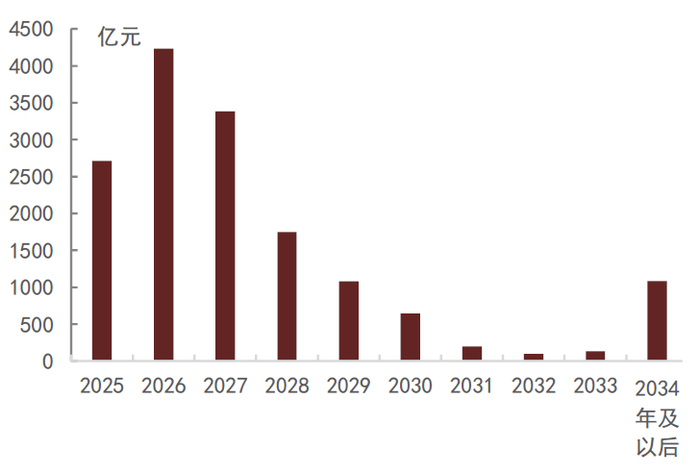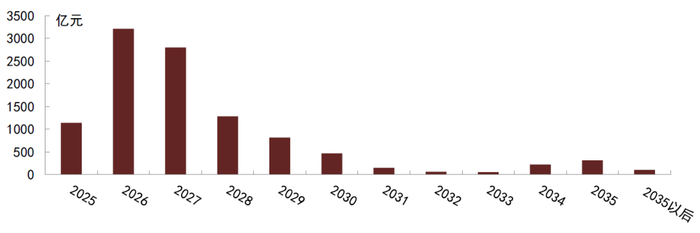 截至2025年7月4日,根据彭博统计,离岸人民币信用债存续规模为10713亿元。分国家和地区来看,中国占比最高为59.5%,美国和法国占比8.4%和6.5%排第二和第三,超主权机构占比6.3%,中国香港占比4.6%,英国占比4.0%,德国占比1.8%,卡塔尔占比1.6%,阿联酋占比1.5%,新加坡占比1.0%,其余占比均在1.0%以下。分行业来看,金融占比最高为57.5%,工业第二占比24.6%,可选消费品、公用事业和材料占比分别为4.3%、1.7%和1.2%,其余占比均在1%及以下。从到期分布来看,其中2025年内到期占比10.6%,2026年和2027年到期占比分别为30.0%和26.1%,2028年和2029年到期占比分别为12.0%和7.6%,2029年及以后占比12.7%,总体来看约9成信用债在5年内到期,约7成在3年内到期,2-3年左右到期占比最高。