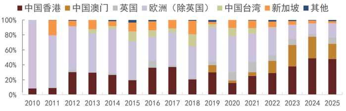 发行场所来看,根据彭博对离岸人民币债券交易所和上市地点的样本统计,目前中国香港交易所是最大的离岸人民币债券发行市场,2024年发行占比达到近50%,其次为中国澳门交易所,占比达到30%,之后为欧洲、伦敦、新加坡等市场。此前,卢森堡一度超过中国香港成为第一大离岸人民币债券发行市场,不过近几年其占比逐步下降。中国澳门交易所于2018年成立,尽管成立较晚,但离岸人民币债券市场发展较为迅速,已经成为重要发行市场之一。