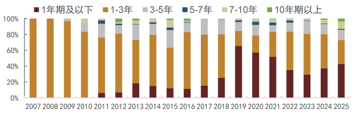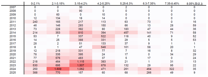 从发行票面利率分布来看,2014年及以前,票面利率在3.15-4.2%区间占比最高,不过高票面利率发行量总体在增长;2015-2017年发行量萎缩阶段,4.2-5.25%区间占比上升;2018年以来,发行票面利率中枢总体下移,基本上都是3.15-4.2%区间占比最高,2024年以来2.1-3.15%区间占比上升至最高。