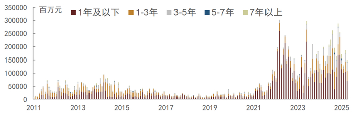 近两年点心债的成交活跃度有所抬升。中国香港债务工具中央结算系统(CMU)托管部分中国香港人民币债券,其定期公布中国香港人民币债券成交额和存续规模,我们可以从CMU托管的债券样本分析点心债流动性情况。2021年以前由于离岸市场规模较小,其整体成交活跃性并不高,月度成交额基本不超过1000亿元,而随着2021年离岸人民币债券市场的快速扩容,托管在CMU的点心债规模抬升至接近1万亿元,其月度平均成交额也大幅抬升至1600亿元左右,最高达到过3000亿元,其换手率也明显抬升,分期限看,1年及以下的债券成交额占比最高,其次为1-3年和3-5年。随着市场的快速扩容以及存量规模明显抬升,2022年二季度以来换手率整体有所下滑,截至2025年4月,托管在CMU的点心债换手率在13%左右, 1年期及以下、1-3年、3-5年和5年以上成交额占比分别为47%、25%、22%和3%。整体来看,近两年点心债流动性明显抬升,主要集中在5年期以下的债券。