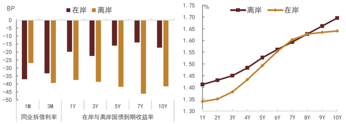 图表30:4月以来离岸利率下行幅度大于在岸(左)目前离岸曲线仍高于在岸(右)
