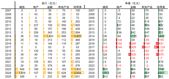 2014年之前信用类点心债市场规模维持增长,金融、地产和其他产业点心债净增维持正增长,2015开始各行业净增量均转负,市场规模转为收缩,2018年地产净增量转正、其他产业直到2021年净增量才转正、而金融净增直到2022年才转正,城投净增2023年开始大幅增长、2024年净增量进一步增长,2021年开始信用类点心债市场规模企稳,2023年以来再度明显扩容。信用类点心债存量结构中金融占比先上升后下降、期间有所波动,地产占比经历两轮明显先升后降,目前占比不高,其他产业类占比先下降后上升,城投占比在2023-2025年明显上升,截至2025年6月末已经接近一半。截至2025年6月末,信用类点心债中城投、房地产、金融和其他产业占比分别为48%、6%、25%和22%。