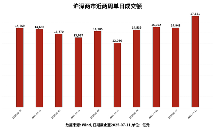 沪深两市成交额为17121亿元人民币,相较上个交易日大幅放量。