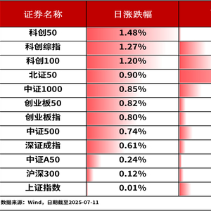 7月11日,A股三大股指放量冲高,稳住3500点。其中,上证指数收涨0.01%,深证成指收涨0.61%,创业板指收涨0.80%。全市场超2,900只股票上涨。主流宽基指数中,科创50指数上涨1.48%,涨幅相对居前。