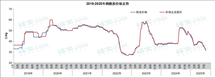 本周烟酰胺市场主流报价30-34元/kg。烟酰胺前端原料价格偏弱调整,工厂逐步下调报价,需求较淡,市场报价与工厂报价基本持平,根据品牌和生产日期不同价格存在差异。