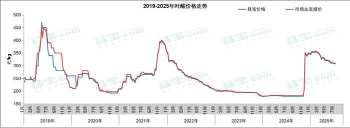 本周国内叶酸市场主流价格295-325元/kg。叶酸市场部分货源价格稍低,下游需求清淡,市场渠道价格窄幅趋弱。后期需关注厂家生产情况和前期订单执行进度。
