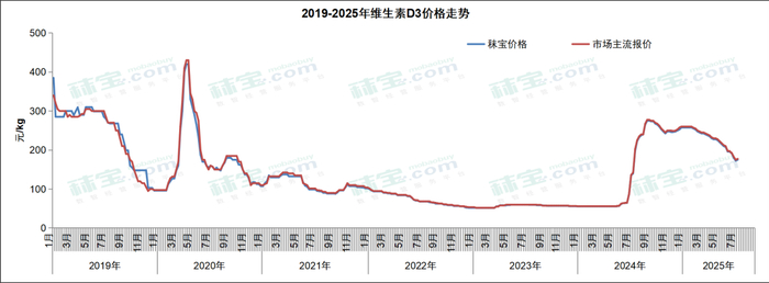 本周维生素D3国内市场主流价格165-190元/kg。维生素D3厂家提价,连日询单活跃,市场报价回升,品牌和日期不同价差较大。后续需关注上游工厂的报价及出货情况。