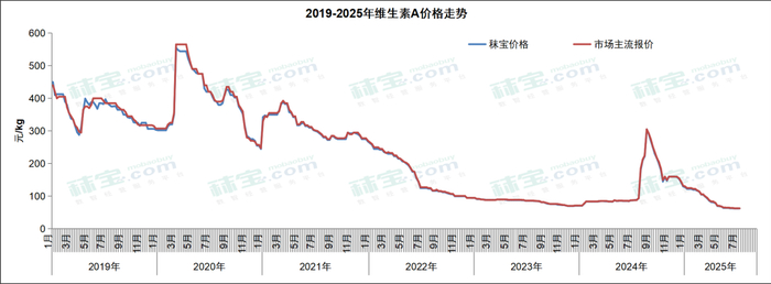 本周国内维生素A500市场主流价格60-66元/kg。维生素A市场价格暂稳,根据品牌和保质期不同,部分价格稍低。预计短期内维生素A价格维持稳定。