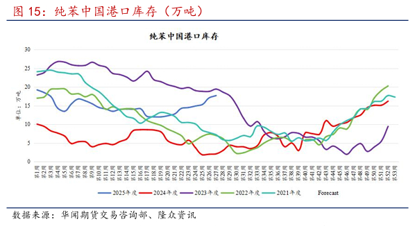 从纯苯港口库存水平来看,2025年1-4月份整体维持季节性走势,处于传统的去库通道,随着进口纯苯数量的增多,港口库存由去化转为累积,当前港口库存为近五年历史同期偏高水平。