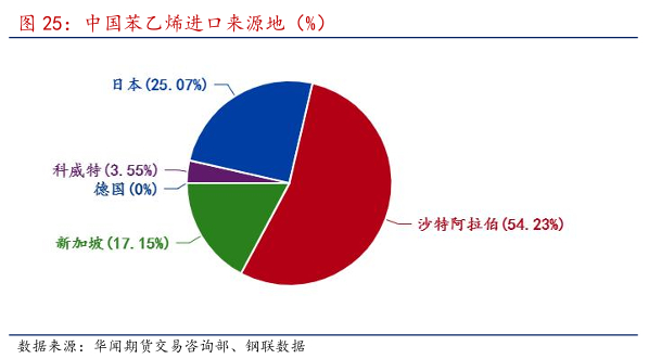 从苯乙烯进口来源看,进口主要来源于沙特、日本以及新加坡,其中沙特占据54%的份额,日本与新加披分别占据25%、17.15%的份额,进口来源国的份额结构变化不大。