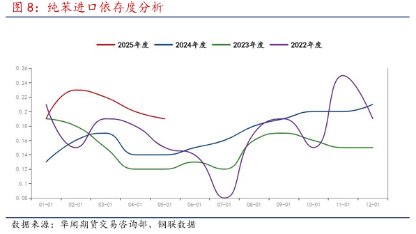 从今年国内纯苯进口依存度来看,今年前5个月纯苯进口依存度处于近四年以来同期高位,3-5月份虽有所降低,但依存度仍位于20%水平左右。
