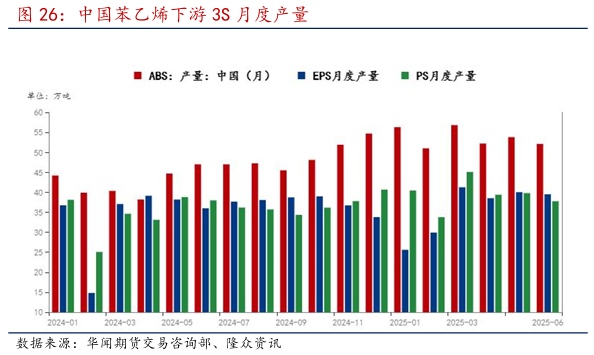 从对苯乙烯的消耗量来看,3S上半年消耗苯乙烯总量在601.5万吨,较去年同期的525.7增长74.77万吨,同比增长约14.2%。较2024年四季度消耗水平相近,主要是由于国补政策的出台及抢出口需求带动了家电的生产需求,据相关政策,家电国补政策将持续全年,下半年3S对苯乙烯消耗或将继续维持高位。