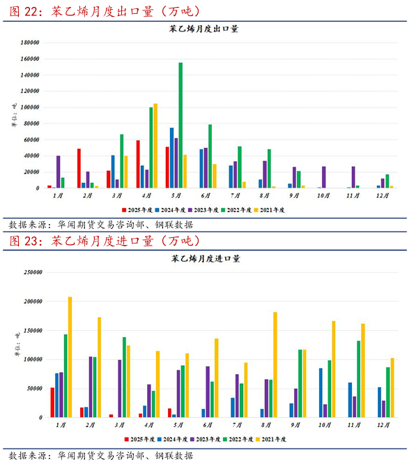 今年苯乙烯出口量整体维持中性水平,据中国海关统计,2025年国内苯乙烯前5个月出口总量为18.43万吨,较去年同期的15.03万吨增加3.39万吨,同比增幅达22.56%。从苯乙烯进口方面来看,2025年前五个月进口总量为9.66万吨,较2024年同期的12.02万吨,减少了约2.36万吨,同比下滑19.63%仅有一月份苯乙烯处于净进口状态。