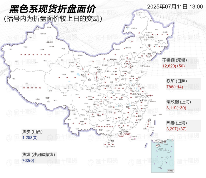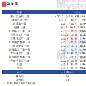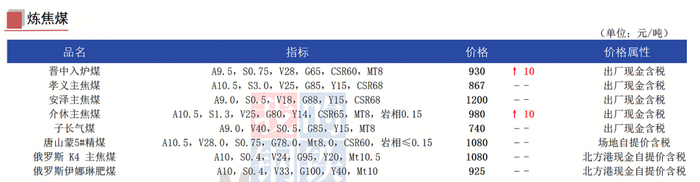 2、内蒙古乌海地区主流煤企炼焦煤价格上调10-20元/吨,其中低硫1/3焦煤(S0.8 A13)上调10元/吨至810元/吨;中硫主焦煤(S1.8 A11)上调20元/吨至860元/吨;高硫1/3焦煤(S2.0 A9)上调20元/吨至840元/吨,新价格自7月12日零时起执行。