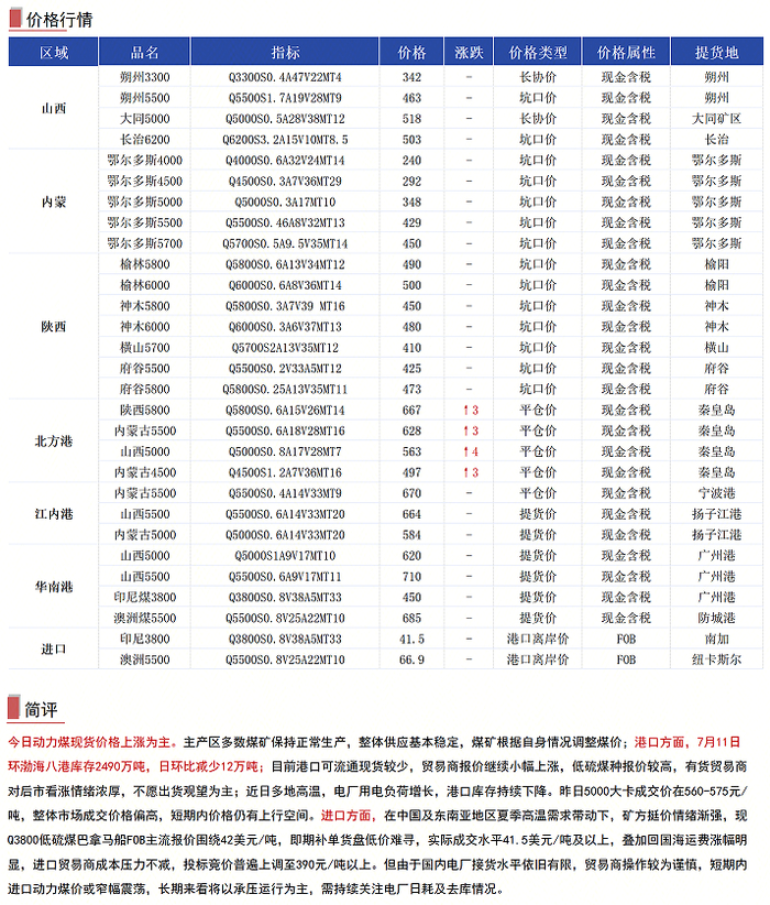 1、坑口煤价稳中小幅探涨,近日产地连续降雨对少数露天矿影响较大,局部矿区产销受限。下游以刚需采购为主,站台大户采购积极性有所好转,部分性价比高的煤矿出货好转价格探涨。目前下游需求变化不大,整体价格僵持调整中,矿方多关注后期终端需求变化。港口方面,港口市场情绪向好,七月上旬主产区降水频繁,部分煤矿生产及运输受到影响,供应端恢复缓慢,港口库存持续去化,市场优质货源供应持续偏紧。有贸易商表示,目前市场交易热度有限,但下游日耗近期提升明显,叠加供应不足,推高市场预期,短期价格难跌。进口煤方面,进口市场跟随国内,预期好转,低价不好买货,7月份货源基本卖完。印尼3800大船FOB42-42.5美金,澳煤5500到岸接近650元,后期关注国内供应以及电厂日耗情况。
