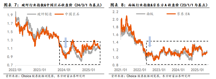 一是以“控量”换取的“稳价”,不涉及明显产能出清:这种模式下行业指数有望止跌回稳,但绝对收益不明显,结构上低成本龙头表现优于二三线企业。以两个案例来看,1)面板:受2022年前三季度大幅亏损影响,2022Q4起面板厂商开始控量保价,此后持续采用调整稼动率方式支撑价格的打法。液晶电池面板价格9月止跌,23年以来维持平稳,申万三级面板行业亦在24年成功实现扭亏为盈。伴随主产品价格的企稳,申万面板指数于22Q4触底,此后持续低位震荡,其中,龙头京东方A的股价表现整体强于行业指数。2)玻纤:2024年3月开始,行业龙头中国巨石发布调价通知,释放“反内卷”信号,其余企业纷纷跟进,24Q4起申万玻纤行业归母净利润同环比回归正增。从股价表现看,中国巨石提价后1月(24年4月)超额收益亮眼,后续虽由于行业库存再度攀升造成行业指数及龙头股价阶段性波动,但整体处于低位稳定区间震荡。
