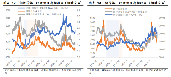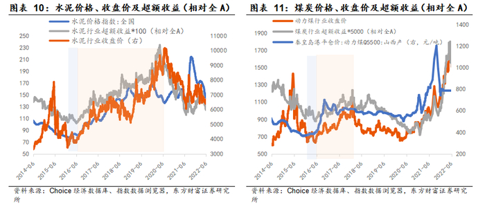 从行业弹性和持续性层面看,优选供需格局更好、行业竞争格局(影响控价能力)更优的板块。如2016H2-2017年的行情中,相同供给去化程度预期下,股价弹性钢铁>煤炭(需求不同);行情持续性上,水泥因盈利能力更稳定、集中度更高的因素,板块持续震荡上行至2020H1,而钢铁随着2018年经济周期触顶则率先回落。