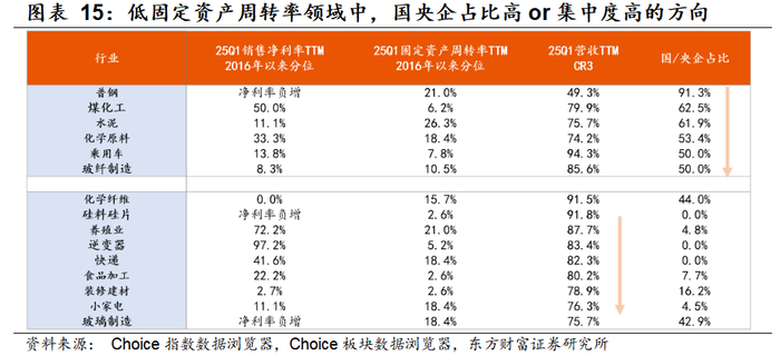 从政策预期角度,更容易有办法/细则出台的方向集中在【国企占比高或行业集中度高】的领域。我们以全A上市公司的营业收入TTM为基数,计算各申万二级/三级行业划分下板块的CR3数据,经梳理,在固定资产周转率TTM低于2016年以来30%分位以下的“内卷”领域中,国/央企数量占比较高的主要包括钢铁、煤化工、水泥、化学原料、乘用车、玻纤制造等,其更容易采用行政手段推进“反内卷”;而国/央企数量占比虽低于50%、但上市公司板块营收CR3较高的方向则主要包括化纤、硅料、养殖、逆变器、快递、食品加工、装修建材等,若采用行业自律或并购重组手段“反内卷”,推进阻碍也相应较小。