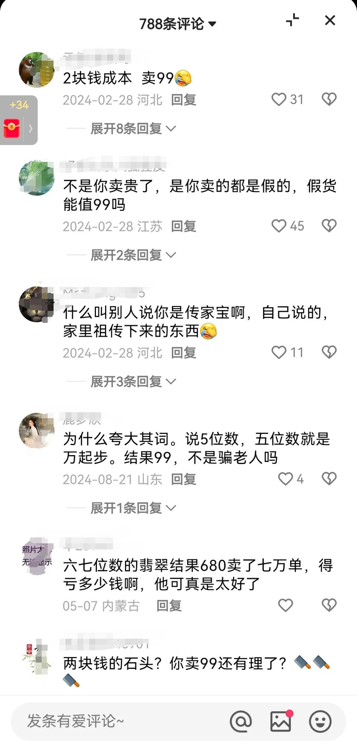 基于此宣传,直播间的不少老年粉丝纷纷抢购。但后续,有消费者称花99元买的手镯,发现和两元店商品差不多,且客服拒绝退货。