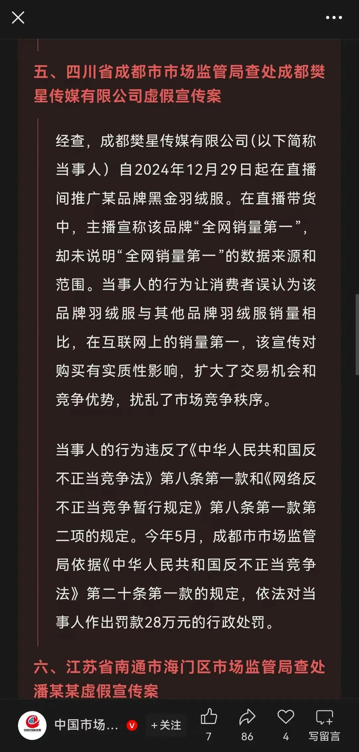 该公司所涉及的虚假宣传案,具体缘由为:经查,当事人自2024年12月29日起在直播间推广某品牌黑金羽绒服。在直播带货中,主播宣称该品牌“全网销量第一”,但并未说明“全网销量第一”的数据来源和范围。