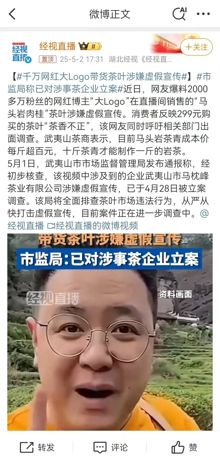 到了4月,抖音千万网红大LOGO直播间销售的一款“马头岩肉桂”茶叶涉嫌虚假宣传,并被立案调查。
