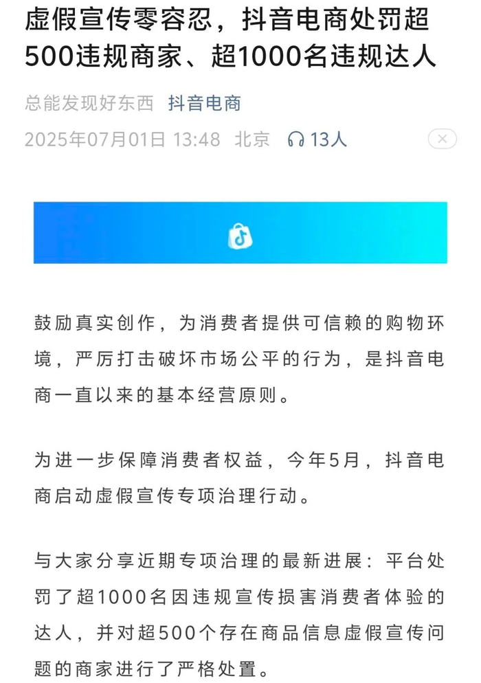 7月初,抖音电商也发布了这段时间治理虚假宣传的成绩单。平台处罚了超1000名因违规宣传损害消费者体验的达人,并对超500个存在商品信息虚假宣传问题的商家进行了严格处置。