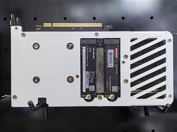 当然最吸引人的还是一款自带双M.2盘位的RTX 5060显卡,这款显卡通过在背板处开口,可以容纳两块SSD硬盘。