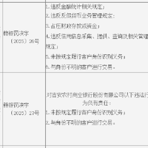 吉安农村商业银行被罚231.83万元:违反金融统计相关规定等