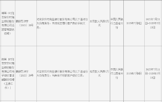同时,徐某辉(时任吉安农村商业银行股份有限公司副行长)对吉安农村商业银行股份有限公司以下违法行为负有责任:1.未按规定履行客户身份识别义务;2.与身份不明的客户进行交易,被处罚款人民币3万元。