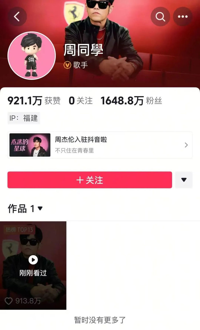 此前9日,有消息称周杰伦将入驻抖音平台,引发市场关注。次日,有网友发现在抖音平台已出现认证为歌手的名为“周同学”的抖音账号,即周杰伦在抖音平台的账号。