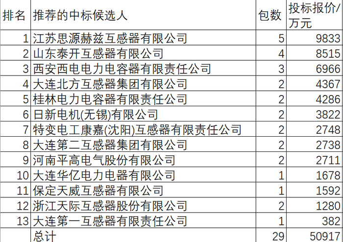 国网2025-3互感器共招29包50917万元,由13家供应商中标提供。