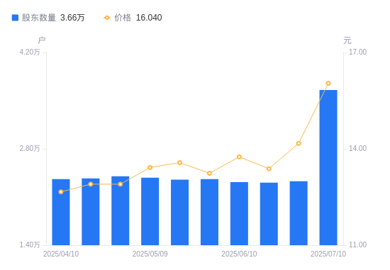 近一年(2024年7月10日至2025年7月10日),宝鼎科技A股股东户数从2.55万户,增加至3.66万户,增幅43.21%,区间股价上涨7.87%。
