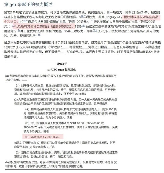 美国国会颁布的《1930年关税法》第321条授权财政部长对某些进口商品免除或减少某些关税、费用和其他税费