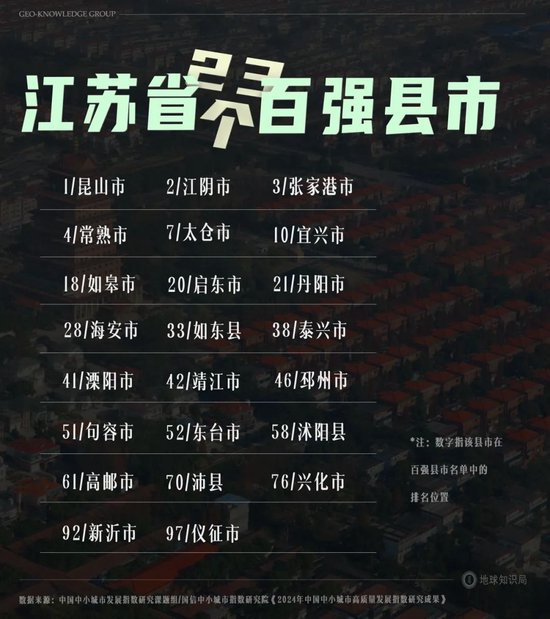 都说江苏是经济强省,还是那种均衡的强,下辖13个地级市均位列“全国百强市”;“全国百强县”榜单中占据了近1/4的席位,TOP10中有超过一半是江苏的县。