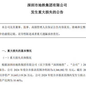 4月29日深圳市地铁集团有限公司(下称“深铁集团”)发布重大损失公告,公告显示,根据2024年度审计报告,深铁集团2024年合并报表范围内,发生亏损334.61亿元,截至2023年末,该集团净资产为3164.31亿元,2024年度合并报表范围内发生亏损,占2023年末净资产比例为10.46%,达10.46%。
