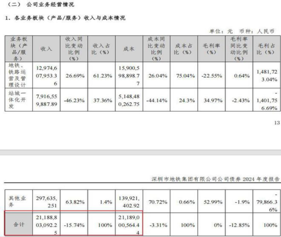 而对于深圳地铁的主营业务,总营收合计211.888亿元,总成本211.89亿元,收支基本相当,也没赚钱。③