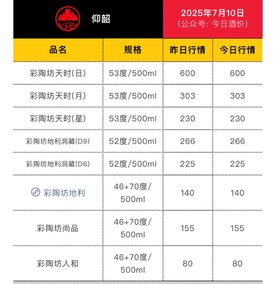 据今日酒价数据,截至2025年7月10日,天时日、天时月、天时星三款产品的批价较年初均出现大幅下滑。其中,天时日从950元/瓶降至600元/瓶,下滑幅度36.84%;天时月由480元/瓶跌至303元/瓶,下滑幅度36.88%;天时星则由380元/瓶滑落至230元/瓶,下滑幅度39.47%。这一价格走势或反映出该系列产品在终端市场的流通价值正缩水,产品溢价能力减弱。
