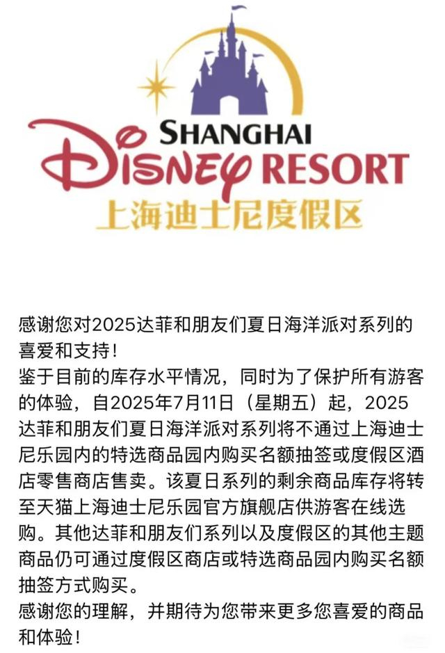 7月10日,上海迪士尼在官方渠道发布通知称,自7月11日起,2025达菲和朋友们夏日海洋派对系列将不通过上海迪士尼乐园内的特选商品园内购买名额抽签或度假区酒店零售商店售卖。