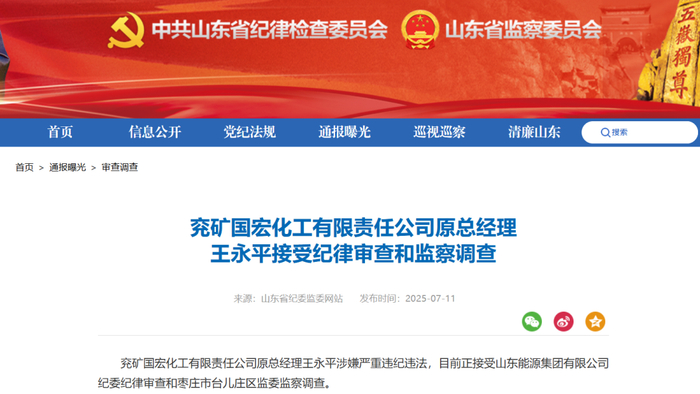 【王永平涉嫌严重违纪违法被查】7月11日,山东省纪委监委网站发布通报——兖矿国宏化工有限责任公司原总经理王永平涉嫌严重违纪违法,目前正接受山东能源集团有限公司纪委纪律审查和枣庄市台儿庄区监委监察调查。