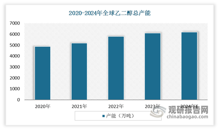 近年来,随着中国、沙特及美国等国家的新增乙二醇产能持续投入使用,全球乙二醇产能不断增长。数据显示,2024年全球乙二醇总产能预计将达到6190万吨,近五年其年复合增长率在8.64%。