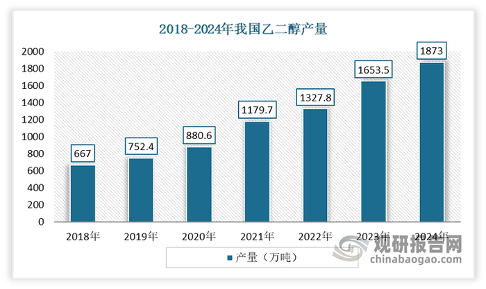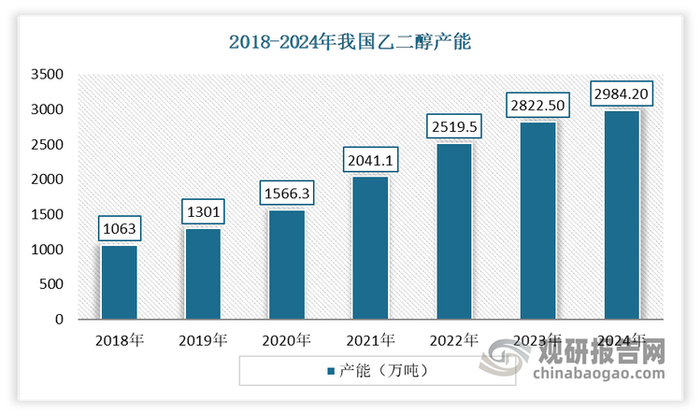 数据显示,2023年,我国乙二醇产能2822.5万吨,同比增长12.03%。值得注意的是,煤制乙二醇的产能为1018万吨,同比增长11.5%,显示出煤制乙二醇在产能增长中的贡献。2024年我国乙二醇产能进一步增长到2984.2万吨,近五年年复增长幅度达到177%左右。