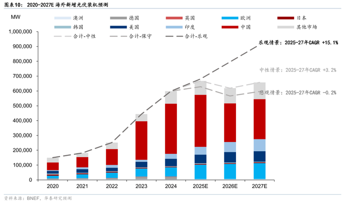 结合BNEF历史数据和我们的预测,2026年全球光伏需求大概在566-790GW,三种不同场景下较2024年增长分别为-0.2~15.1%;其中2025-27年海外市场每年光伏新增装机在317-388GW,CAGR达14.2%,拆分来看,美国+11.5%,欧洲+19.9%,亚非拉市场+17.9%,其中可能有较大增长动力的是印度2025-27年CAGR可达35.5%,显示未来增长潜力还是需要和人口挂钩。基于2025年至今装机节奏,实际装机表现介于悲观和基准情形之间,如果乐观假设在明年实现储能平价,则需求增长会相对平稳,我们预测明年国内光伏装机需求有望增长至300GW。