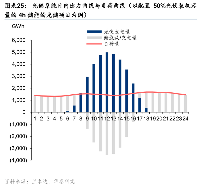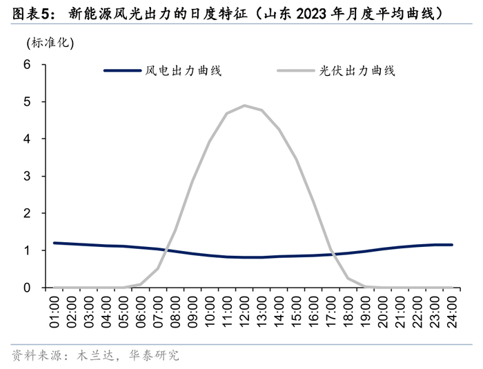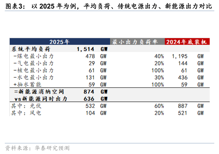 我们基于2011-2023年电网最高负荷CAGR6.3%、2023年电网最高负荷1,339GW线性外推,预测2025年最高负荷约为1,514GW,2024年末电力系统中火电装机为1,195GW,调峰深度在40%,因此最低出力在478GW,气电调峰深度可低至20%,对应29GW的最低出力;假设水电最小出力负荷率为30%,对应131GW;核电61GW与抽蓄59GW可抵消,剩余874GW空间为风光消纳空间,即使考虑全部消纳空间给予光伏,考虑60%同步率,即光伏空间1,457 GW,而光伏2025年上半年末达到1,050GW,考虑2024年年底风电装机521GW均有相同优先发电权,因此消纳极限已经不远。2024年放开新能源消纳率95%红线,以及加快建设新型电力系统,与其背后的电力系统日内不平衡压力所在有关。由于火电调峰整体对电力系统成本最低,额外的灵活性资源需要额外系统成本,因此就不难理解25年136号文件推动新能源和储能入市是希望通过市场化手段寻找一条最经济的解决路径。