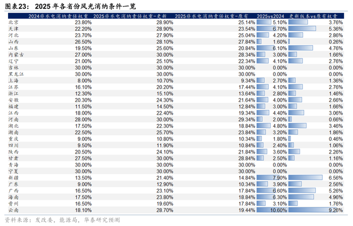 绿电消纳权责显著拉升,为风光装机打开空间。7月2日,发改委和国家能源局印发《关于2025年可再生能源电力消纳责任权重及有关事项的通知》,下达对各省2025年可再生能源电力消纳责任权重的约束指标,相较原有权重(去年下发的2025年电力消纳权责预期目标)有明显提升。基于更新版本,我们测算并预测2025年全国完成消纳考核所需风光发电量为2.30万亿度,较原有权重下完成消纳考核所需风光发电量2.03万亿度提升0.27万度;兑现到额外风光消纳条件,在更新版本权重下2025年具备0.53亿度的额外消纳空间,而原有权重仅有0.25亿度消纳空间。对应到风光装机侧,我们测算在更新版本权重下可提供359GW的风光装机空间,较2024年新增装机357GW水平持平微增,较原有权重对应风光装机增加约一倍。