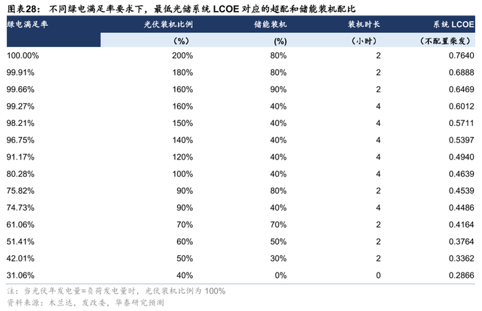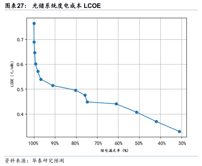 光储绿电直连可在用电侧实现平价。光伏发电出力集中导致与负荷需求曲线错配明显,因此在绿电利用率以及经济性双重要求下均对配储具备较高需求,可以看到从30%之后绿电利用率开始就需要增加配储需求,而绿电利用率达到80%之前光储系统发电成本增长缓慢,主要是配储比例逐步提升,但是从80%提升至95%的过程中由于超配比例快速上升,系统成本稳步上升,在95%以上进一步增长时则配储需求明显提升,反应为系统LCOE随之快速抬升。从测算结果来看在配储40%储能装机容量、4小时储能时长下可达到80%的绿电利用率,对应LCOE约为0.46元/W。从目前成本看用电侧存在平价的可能,但是发电侧目前还难以平价。