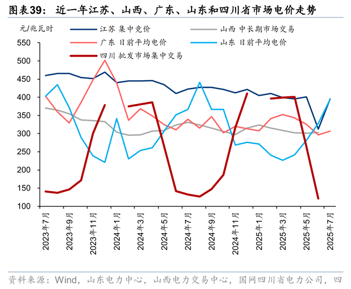 另一方面,电价也是影响硅料成本的重要因素,未来产能或将进一步集中于低电价区。多晶硅电力成本占比超30%,行业内成本差距主要在于电耗和电价,考虑到一二线企业电耗已经拉开差距,我们认为在产业整合周期后电价将成为关键因素。以四川地区为例,5月以来四川电价持续走低,5月和6月批发市场集中交易平均价格分别环比降低34%/54%,而当地头部硅料厂商通威股份和协鑫集团相应上调开工率,根据Infolink,通威7月和8月开工率上调13/18pct,协鑫则于8月份上调9 pct开工率。
